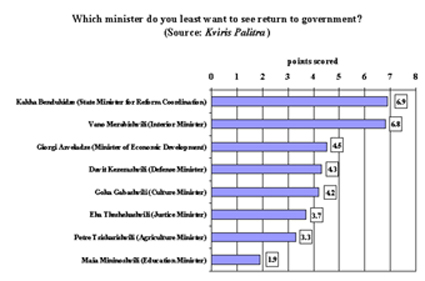 With a cabinet reshuffle due by the end of the week, the newspaper Kviris Palitra asked 509 people which ministers they want out of the government. Respondents were asked to rank a list of eight officials, in order of reverse preference.