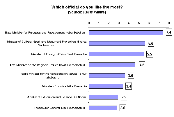 The newspaper put the question, “Which minister do you like the most?” to 526 people, asking them to rank a list of eight in order of preference. The list did not include the widely unpopular Interior Minister Vano Merabishvili.