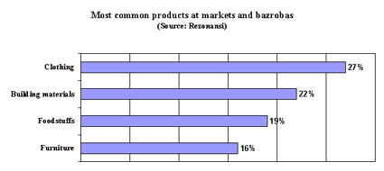 There are 338 markets and bazrobebi registered in Georgia, nearly half of which are in Tbilisi, according to the Department of Statistics. The most common stock in Georgian markets and bazrobebi is clothing, making up 27 percent of all goods, closely followed by building materials and food.