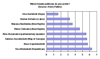 Tina Khidasheli of the Republican Party is the most popular female politician according to a survey carried out by the newspaper Kviris Palitra. The newspaper put the question “which female politician do you prefer?” to 603 people—348 men and 222 women. Respondents had to rank a list of eight options in order of preference.