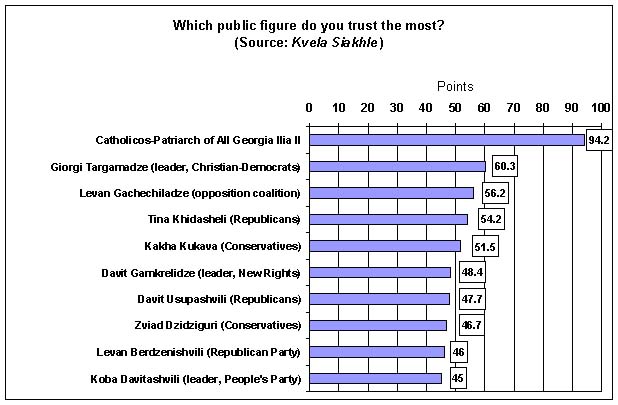 The International Center on Conflict and Negotiation asked 1000 Tbiliselebi which political or public figure they trust the most, the newspaper Kvela Siakhle writes. They were asked rank a list of 36 in order of preference; the top ten are shown below.