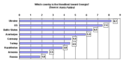 The public perceives Ukraine to be the friendliest country toward Georgia, according to an opinion poll conducted by the newspaper Kviris Palitra. The newspaper asked 609 people to rank a list of nine countries in terms of perceived friendliness.
