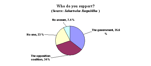 An informal telephone poll of 500 Tbilisi resident printed in the newspaper Sakartvelos Respublika suggests that the government and the opposition have roughly equal support in the city.