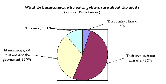 Kviris Palitra in an informal poll said they thought businessmen that go into politics care most about the fate of their businesses. The newspaper put the question, “What do businessmen who enter politics care most about?” to 401 people, but did not specify the methodology or location of the survey.
