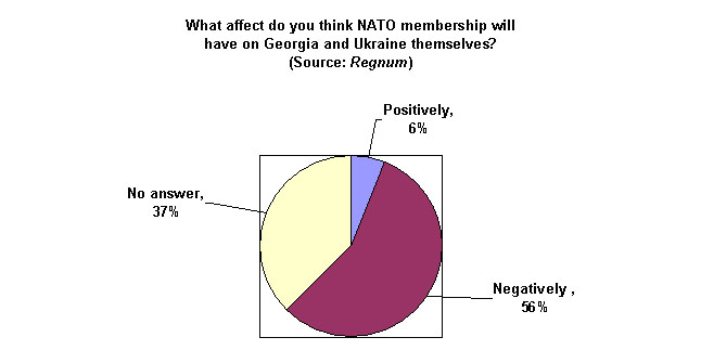 The survey revealed that some 53 percent of Russians think NATO membership would have negative consequences for Georgian and Ukraine themselves, while only 6 percent think it would have an overall positive effect.