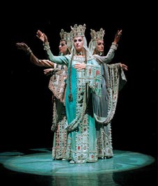 Women have always played a significant role in Georgia’s history, as is perfectly shown by the dance Samaia. This is performed by three women and is considered to date from pagan times. However today’s Samaia is a representation of King Tamar and her glory. King Tamar is described in many sources as Queen of Georgia, but she was considered to be the king of the United Kingdom of Georgia in 12th-13th centuries and was the first female king in Georgia’s history. There are only four frescos that bear the much-revered image of King Tamar and Simon Virsaladze based the costumes of Samaia on the King’s clothing in these frescos.