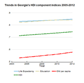 In the high human development category, Georgia is positioned at 72 with an HDI of 0.745 for 2012.The HDI value has increased from 0.713 to 0.745 since 2005, but it is still below the average of 0.758 for countries in the high human development group and below the average of 0.771 for countries in Europe and Central Asia. However, it is still higher than the HDL of Armenia which is 0.729, making the country 87th on the ranking.