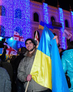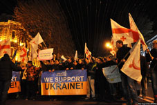 Georgian citizens also decided to express solidarity with Ukrainians. Several hundred people gathered in the center of Tbilisi, outside Tbilisi City Hall, which was lit up in blue and yellow, the colors of the Ukrainian flag. The demonstrators were joined by Tbilisi Mayor Gigi Ugulava and members of the UNM party.
