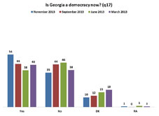The National Democratic Institute (NDI) released the results of its November 2013 survey on public attitudes in Georgia on December 18. The survey was conducted through nationwide face-to-face interview with 3,915 respondents collected dating from November 13 through November 28.