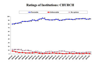 For 94% of the surveyed, the church was the most trusted institution in Georgia, followed by the Army at 93%. Georgian media took third place with 84%. Television remains the number one source of information for the Georgian population. Rustavi 2 was named the most trusted media outlet with 34% of the votes, followed by Imedi TV with 30%, Maestro TV with 21% and GPB with 3%.