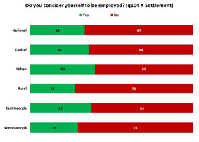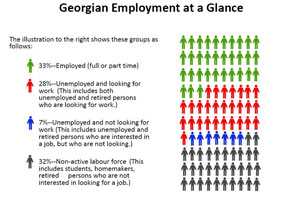 The research of the National Democratic Institute (NDI) revealed some interesting figures concerning the employment issue in Georgia. 33% of those responding said they are employed either full or part-time, 28% are unemployed and looking to find a job, 7% are unemployed but are not looking for a job, 32% are not active. These are students, pensioners, homemakers, and those who are not looking for a job.
