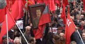 The celebration of the victory looked rather different in Stalin’s hometown of Gori, where members of Communist party held a rally, waving Soviet flags.