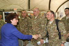The event continued with an award ceremony. Tinatin Khidasheli awarded Chief of GLT, Major James Geiger and Sergeant Major Scott Perry with the medals “General Mazniashvili” and “General Kvinitadze” for their contribution in strengthening the Georgia-US military cooperation. At the ceremony 30 Georgian soldiers received certificates of appreciation for their duties carried out during the mission. The commander of the 43rd Battalion, LTC Vitali Tskhadadze expressed gratitude towards 11 military servicemen of the coalition forces.