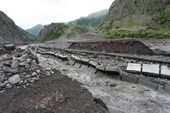 This caused the Tergi River to back up and forge a new route, which completely swept away an 800m section of the Mtskheta-Stepantsminda-Larsi Rd (Georgian Military Highway) near the Devdoraki glacier.