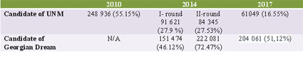 In 2014, 44% of the registered population took part in elections of Tbilisi Mayor. At this time, the minimum vote margin to win the elections in the first round was 50%+. In the first round, a candidate of the Georgian Dream (GD) David Narmania received 151 474 (46.12% of) votes, a candidate of the UNM, Nika Melia got 91 621 (27.9 % of) votes. In the second round, Narmania received 222 081 votes (72.47%) and Melia gained only 84 345 votes (27.53%).