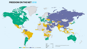 Evaluation of each country includes a detailed narrative report and a numerical score based on three categories: an obstacle to access, limits on content and violations of user rights. The 2018 report covers the period between June 2017 and May 2018. (IDFI)