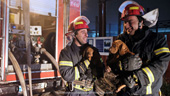 Firefighters rescued two puppies from the blazing building.