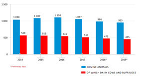 Among them, the total number of dairy cows and buffalos decreased by 4.3 percent from the same period of the previous year and equaled 454.8 thousand heads.