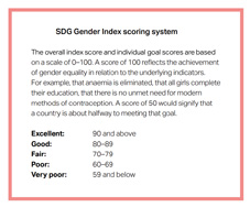 Sixty countries are failing on SDG 5 (the standalone goal on gender equality), with a “very poor” score of 59 or lower, and another 24 countries “barely pass” with a “poor” score between 60 and 69. However, the index encompasses other goals that relate to gender equality issues.