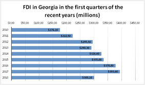 In quarter 1, 2019, foreign direct investment (FDI) in Georgia amounted to $281.1 million, which is a 6.3% reduction compared to the same period of the previous year.