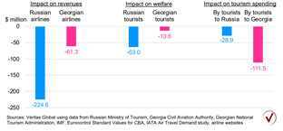 Visitors from Russia, which make up about 82% of direct travelers, will experience a loss in consumer welfare of $63 million compared to $13.6 million losses for travelers from Georgia.