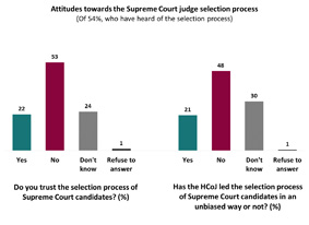 In terms of awareness of the Supreme Court candidates' selection process, the public is also divided. Around half of the Georgian-speaking adult population (54%) heard about the selection process of Supreme Court candidates. Nevertheless, their attitude towards it is is not particularly positive, as the process is not trusted by about half of those who have heard about the selection (53%). Furthermore, nearly half of those who heard about the method of selection say the selection was not impartial (48%).