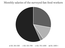 The average salary in fast food chains is GEL 494, which is a relatively high figure compared to the remuneration of the supermarket employees, where the average salary was GEL 362.
