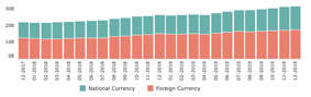 By the end of December 2019, the total volume of national currency-denominated loans to resident legal entities issued by commercial banks amounted to 4.58 billion GEL (3.38% more compared to the previous month), and foreign currency-denominated loans constituted 10.67 billion GEL (2.37% more; exchange rate effect excluded volume of lending in foreign currency increased by 5.32%).
