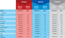 Georgia’s largest trading partner is still Turkey with $697.4 million, followed by Russia, China, Azerbaijan and Armenia with $584.2 million, $530.7 million, $450.9 million and $282.5 million, respectively.