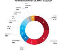 As for the sectors, the largest share of FDI was registered in the financial sector, reaching $78.1 million in Q2 2020, the energy sector was second ($29.6 million), followed by the construction sector ($27.7 million).