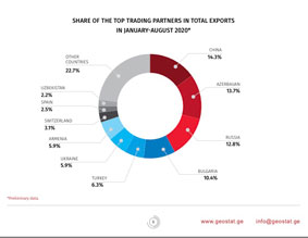 Turkey remains Georgia’s largest trading partner with $970.3 million in January-August 2020, followed by Russia, China, Azerbaijan, and Armenia with $820.6 million, $737.4 million, $593.8 million, and $385.6 million, respectively.