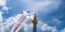 Newly modernized Su-25 fighter jets of the Defense Forces flew over Freedom Square and congratulated the citizens on Independence Day by launching smoke in the colors of the Georgian flag.
