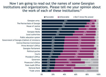 According to a newest survey, 60% of respondents believe that the United States is the most important political partner for Georgia, 56% consider the EU to be Georgia's most important political partner, 32% say that it’s Ukraine, 11% - Russia, Turkey - 10 %, Armenia - 5%, China - 4%, Iran - 1%, None of the countries - 3%.