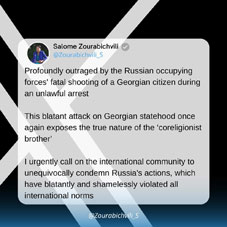"I am deeply outraged by the killing of a Georgian citizen during illegal detention by the Russian occupying forces. This brutal attack on Georgian statehood once again exposes the true face of the 'co-religionist brother."