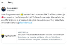 "The Swedish government has decided to donate SEK 5 million to Georgia as a part of the Substantial NATO-Georgia package. The money is to be used for projects in areas such as crisis management, cyber security, and information sharing," Swedish Ambassador to Georgia Anna Lyberg wrote on X.