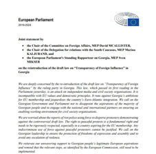 MEPs David McAllister, Sven Mikser, and Marina Kaljurand issued a joint statement expressing deep concern over the reintroduction of the draft law on "Transparency of Foreign Influence" by the ruling party in Georgia, which they see as an attack on independent media and civil society organizations.