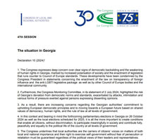 The Council of Europe's Congress of Local and Regional Authorities passed a declaration titled "The situation in Georgia," with 76 votes in favor, 10 against, and 6 abstentions.