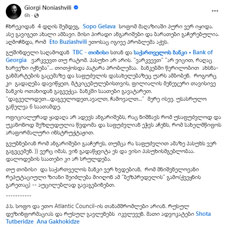 "After four days of searching, Sophie could not buy bread in the store. That's how we heard the news. His personal accounts and cards are frozen," Noniashvili stated. He described their attempts to get answers from TBC Bank and the Bank of Georgia as frustrating, saying, "They refuse to give a written explanation and to name the reason."