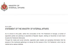The Georgian Ministry of Internal Affairs (MIA) issued a strong warning on November 22 ahead of protests planned in Tbilisi on November 24. The Ministry cautioned organizers and participants against actions that could disrupt the first session of the 11th parliamentary convocation, warning of severe legal consequences for violations.