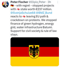 "Germany has, with regret, suspended projects worth Euro237 million with Georgia," Fischer stated. "We stopped the financing of green hydrogen, energy grid, water infrastructure in Batumi. Support for civil society and rule of law stays."