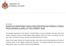Georgia's Ministry of Internal Affairs announced on May 6 that 96 foreign nationals were expelled from the country during the month of April. According to the ministry, the removals were carried out in accordance with the law, with some individuals departing voluntarily, while others were deported following enforcement measures by the Migration Department.