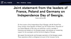 On the occasion of Georgia's Independence Day, French President Emmanuel Macron, Polish Prime Minister Donald Tusk, and German Chancellor Friedrich Merz issued a joint statement sending a message of friendship and solidarity to the Georgian people while expressing serious concerns about the state of democracy in the country.